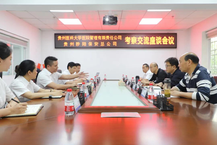為增進(jìn)對保安公司營運(yùn)情況的了解,2021年5月19日,貴州醫(yī)科大學(xué)科技創(chuàng)新與產(chǎn)業(yè)發(fā)展處處長、醫(yī)院管理公司總經(jīng)理涂波等一行三人蒞臨貴州陟翔保安總公司考察交流,集團(tuán)公司馮波董事長帶領(lǐng)班子成員與考察小組進(jìn)行座談交流。