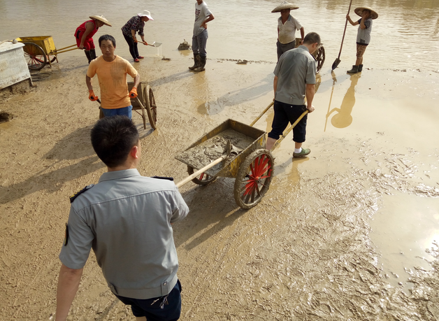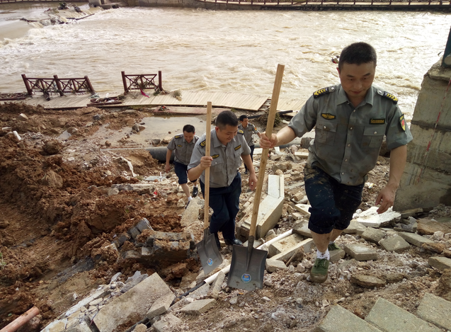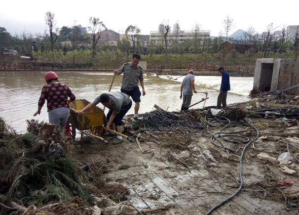 同時,洪水還導(dǎo)致了沿河兩岸絕大部分的沿江步道被淹,綠化、亮化、沿線亭閣、景觀、護(hù)欄均被嚴(yán)重沖毀,河岸邊步道上留下了大量白色垃圾和淤泥。為了使災(zāi)后堆積的垃圾能夠盡快得到清理,小分隊(duì)與環(huán)衛(wèi)工人一起出動清淤的同時還將被洪水沖毀的護(hù)欄邊的垃圾也一同清理干凈。