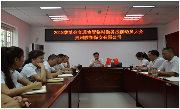 2018中國(guó)國(guó)際大數(shù)據(jù)產(chǎn)業(yè)博覽會(huì)于5月26日至29日在貴陽(yáng)舉行,作為貴州保安行業(yè)的領(lǐng)軍企業(yè),貴州陟翔保安有限公司承接了貴陽(yáng)數(shù)博會(huì)園區(qū)500名交通協(xié)管臨時(shí)勤務(wù),為確保此次臨時(shí)勤務(wù)的順利實(shí)施和完成,5月18日下午,總公司全體員工、保安公司全體領(lǐng)導(dǎo)及大隊(duì)長(zhǎng)在總公司會(huì)議室召開了2018數(shù)博會(huì)交通協(xié)管臨時(shí)勤務(wù)戰(zhàn)前動(dòng)員大會(huì),會(huì)上,總經(jīng)理陳春生同志對(duì)此次臨時(shí)勤務(wù)作出重要指示,并對(duì)此次臨時(shí)勤務(wù)做了統(tǒng)一安排部署。數(shù)博會(huì)勤務(wù)領(lǐng)導(dǎo)小組組長(zhǎng)由總公司總經(jīng)理馮波擔(dān)任,指揮組組長(zhǎng)由保安公司總經(jīng)理陳春生擔(dān)任,同時(shí)還成立了協(xié)調(diào)組、后勤保障組,新聞報(bào)道組等,對(duì)所有參與人員進(jìn)行明確分工。