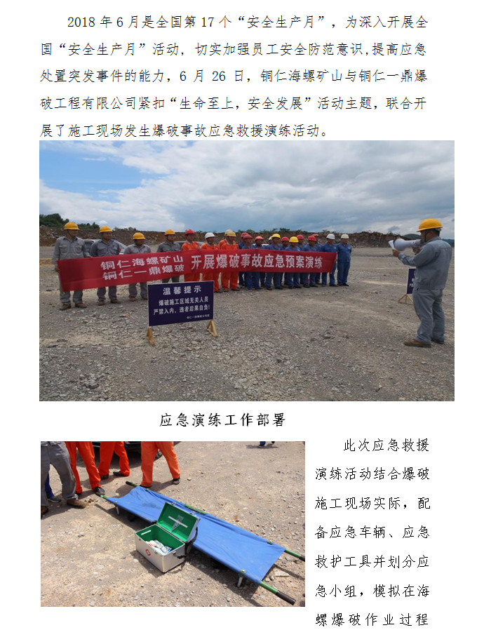 > 銅仁海螺礦山與銅仁一鼎爆破聯(lián)合開(kāi)展“安全生產(chǎn)月”爆破事故 應(yīng)急救援演練活動(dòng)