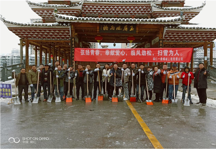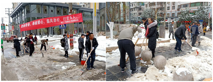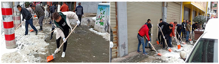 上午10點,員工們頂著風(fēng)雪,陸續(xù)來到公司。在項目部張總的帶領(lǐng)下,大家不畏嚴(yán)寒,揮舞著鐵鍬開始對縣城風(fēng)雨橋附近的人行道及斑馬線的積雪和結(jié)冰進行清掃。大家你追我趕,齊心協(xié)力,配合默契,鏟的鏟、推的推、掃的掃,干的熱火朝天,不亦樂乎,忙碌的身影構(gòu)成了一道亮麗的風(fēng)景線。雖然室外溫度很低,但大家勞動的熱情和團結(jié)的力量讓這個冬日變得格外溫暖。